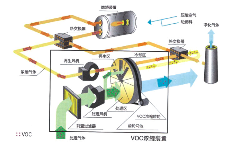 ②含有VOCs的被處理廢氣通過前置過濾器后,送到濃縮轉輪的處理區。在處理區VOCs被吸附劑吸附除去,空氣被凈化后從縮轉輪的處理區排出。